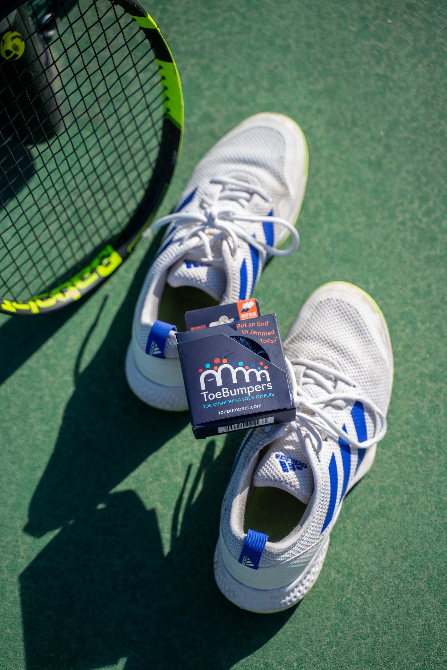 Toe Bumpers are a more efficient solution, as you can pop them over any athletic sock vs. putting them on toe-by toe.